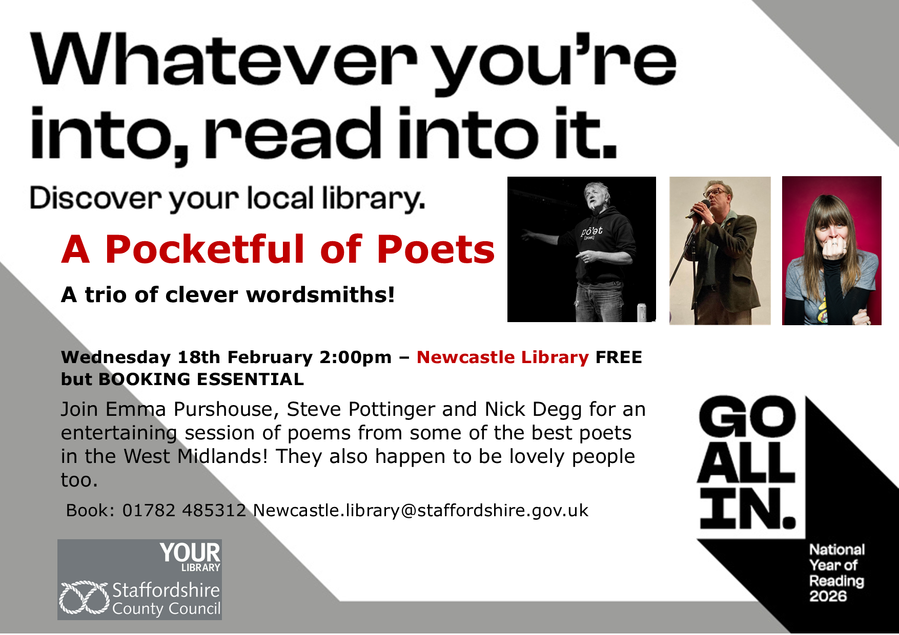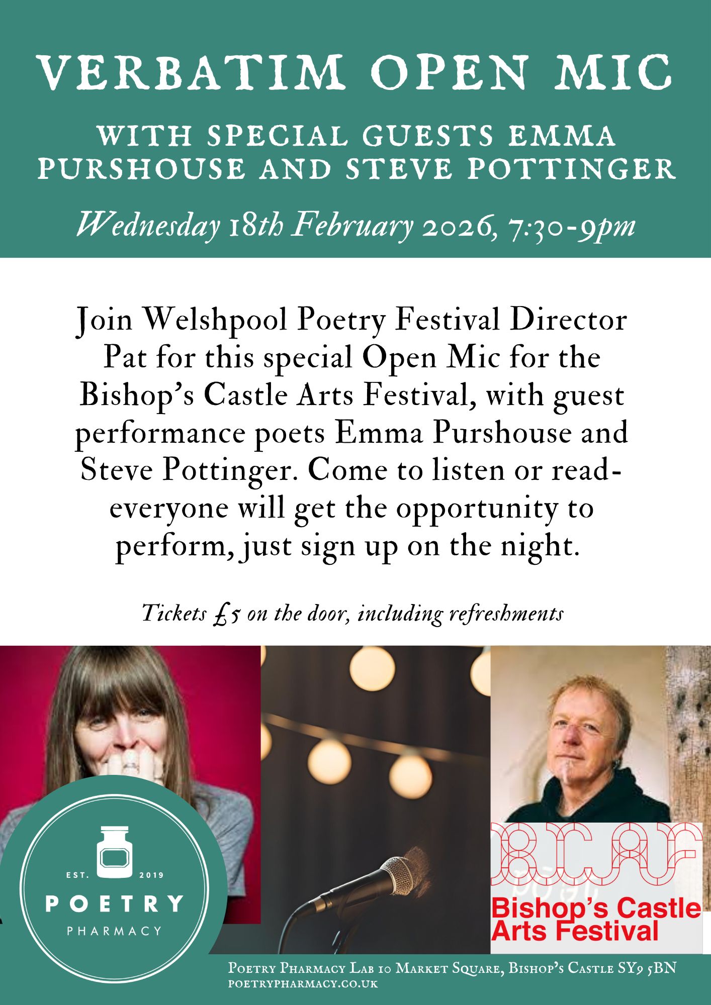 The following night, both of us are guest poets at Verbalise, in Kendal (open mic spots also available) and if you rewind to Wednesday Feb 18th, we’re doing two gigs a little closer to home. In the afternoon, we’re part of A Pocketful of Poets at the library in Newcastle-under-Lyme (2pm start, free entry, booking essential) after which we scoot across to the Poetry Pharmacy in Bishops Castle to be the feature poets at Verbatim. All the details for these two gigs are on the posters below. Gigging in February… at least I’ll get to see what rain looks like in different parts of the country. Snorkels and wetsuits optional.